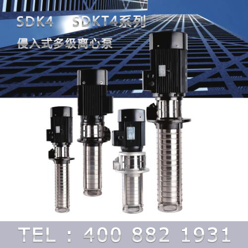 SDK4/SDKT4為配用標(biāo)準(zhǔn)電機(jī)的非自吸立式多級離心泵,電機(jī)軸和泵軸用聯(lián)軸器直接聯(lián)接的結(jié)構(gòu)。為滿足水槽或容器的安裝深度,可安裝空套的腔體來改變泵本身的侵入 深度。