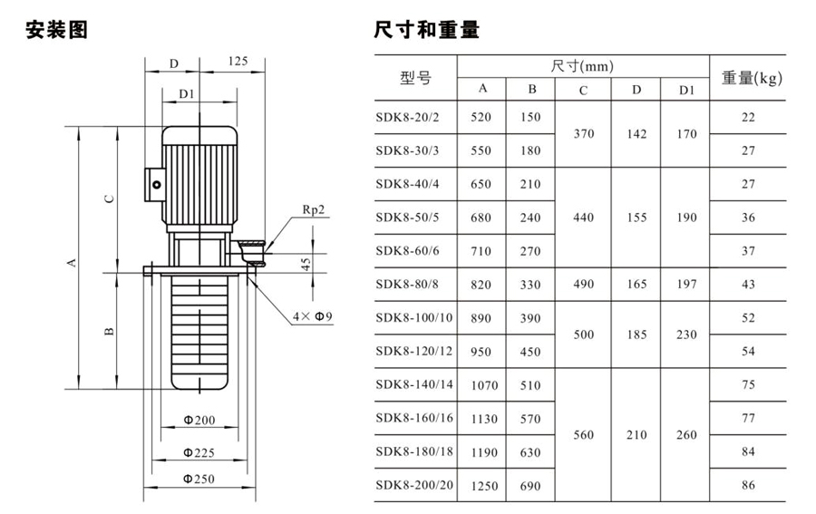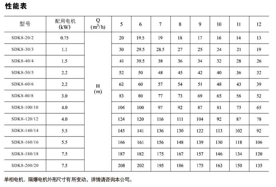 SDK8/SDKT8為配用標準電機的非自吸立式多級離心泵,電機軸和泵軸用聯軸器直接聯接的結構。為滿足水槽或容器的安裝深度,可安裝空套的腔體來改變泵本身的侵入 深度。